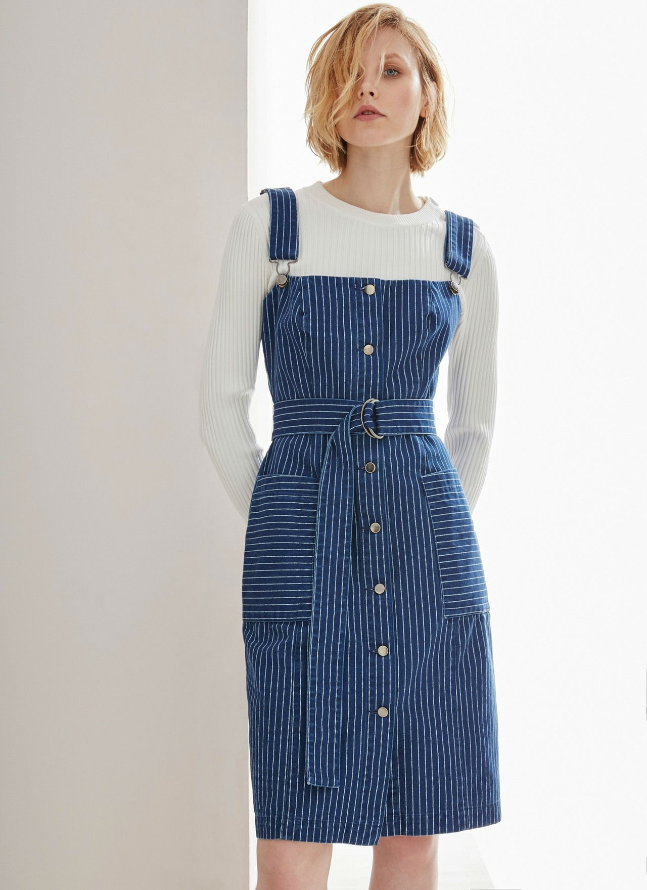 Vestido tipo pichi en tejido vaquero con diseño a rayas verticales, inspirado en la estética de los años 70. Lleva cierre de botones metálicos en el delantero, dos maxi bolsillos en el frontal y cinturón de lazada.