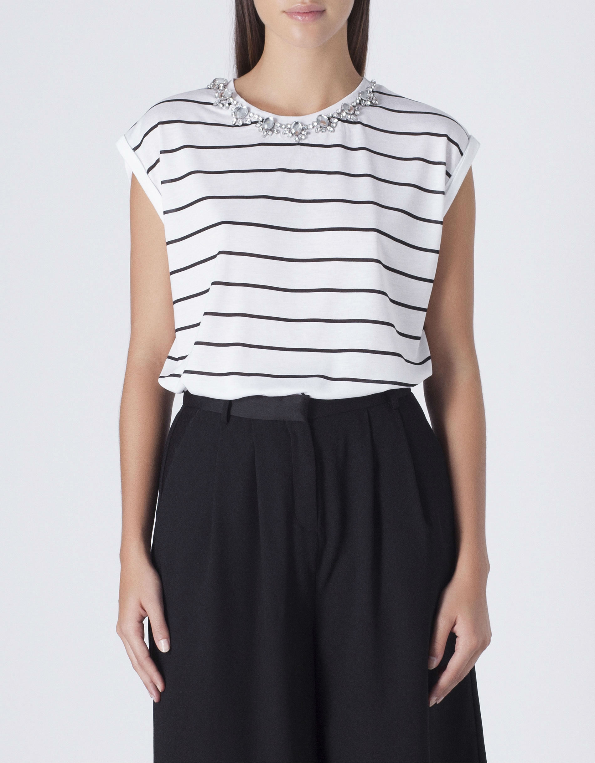 La típica camiseta de rayas Bretón o marineras es todo un clásico en el panorama de la moda. Suiteblanco se anima a incluir este print en nuestro fondo de armario para esta temporada aderezando el estampado con un aplique luxury a modo de collar.