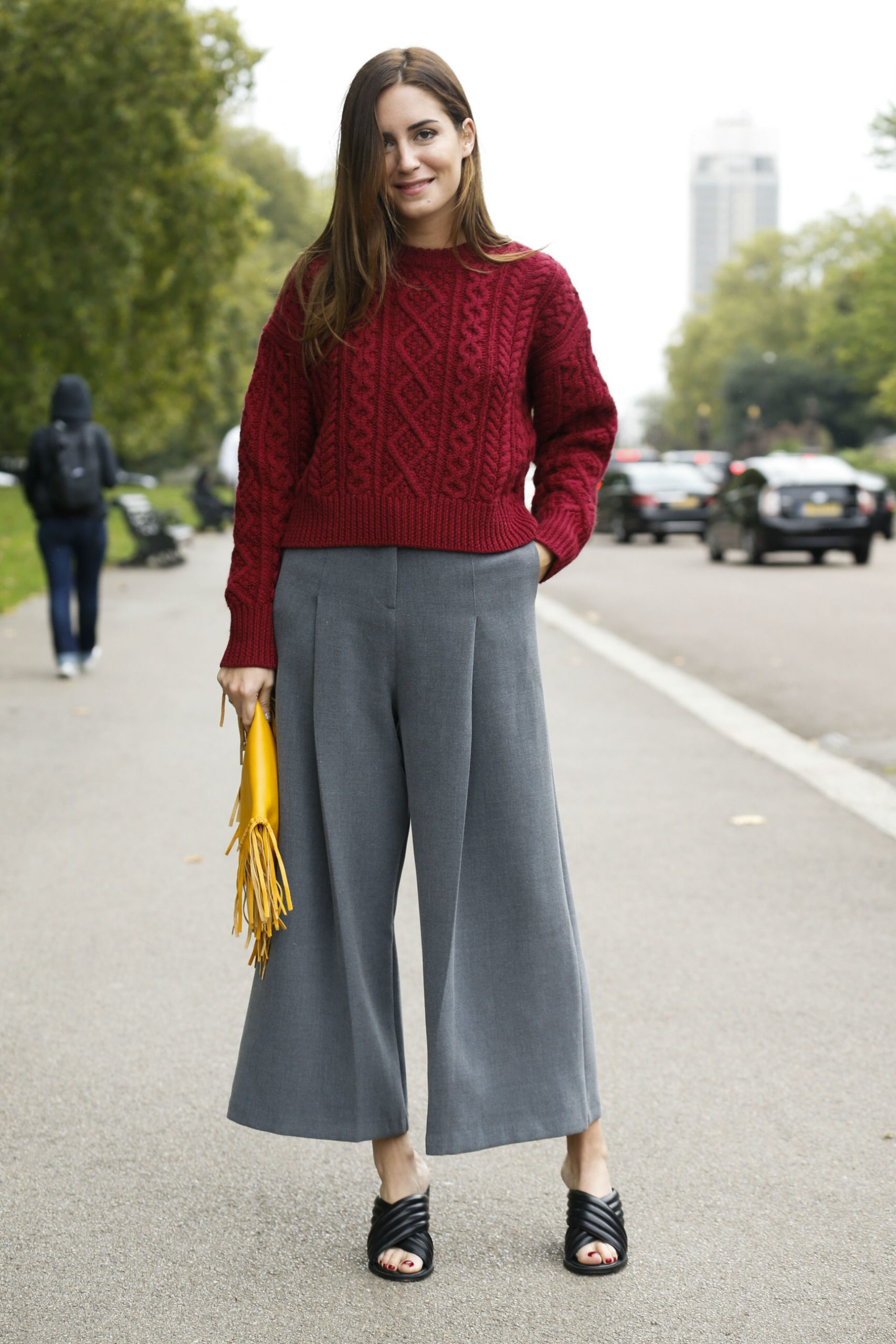 Es el estilismo más arriesgado, muy en la línea de la It Girl Am Lul. Jersey de ochos burgundy, pantalones culotte grisáceos, clutch de flecos amarillo y sandalias urban negras. Si analizamos producto por producto, podemos decir que todos son grandes must have de esta temporada. Gala González apuesta por combinarlos todos, creando un look de lo más singular y fiel a su estilo.