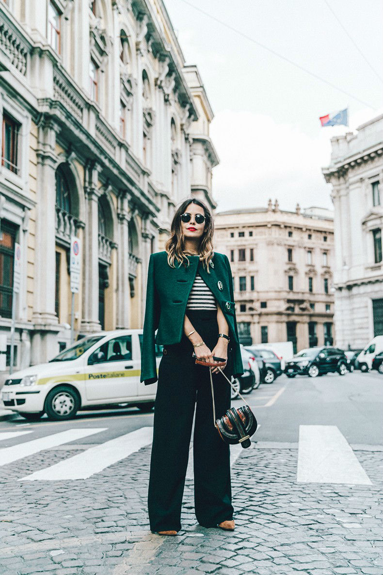 Con ese allure parisino que tanto nos gusta, Collage Vintage es fan del estilo retro y aquí queda demostrado que es experta en la materia. Los pantalones plazzo de tiro alto han regresado, si alguna vez se fueron, a los armarios más chic del panorama fashionista. La española conjuga su pantalón con una camiseta de rayas Bretón y una chaqueta estructurada que destila una esencia vintage enigmática.
