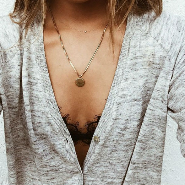 Hay escotes y escotes, todo hay que decirlo. Si la combinación que empleas es como la que te mostramos, en ese caso el resultado es sencillamente perfecto. ¿Cómo conseguirlo? Muy sencillo, saca del armario un cárdigan de punto grueso, un sujetador de encaje y varios colgantes minimalistas que decoren el cuello.