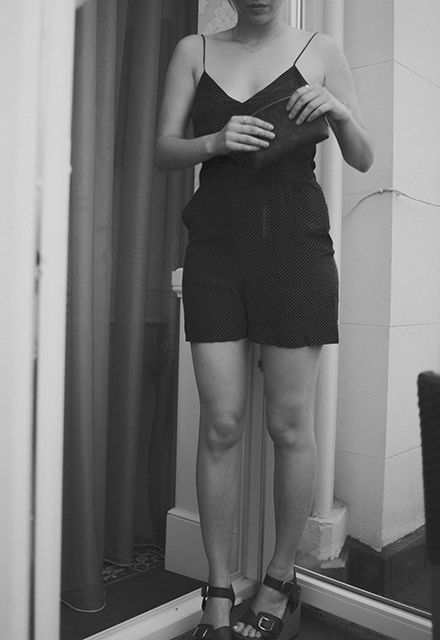 El mono de tirantes con estampado de topos en blanco y negro es de Bershka, puedes hacerte con él por sólo 17’99€!