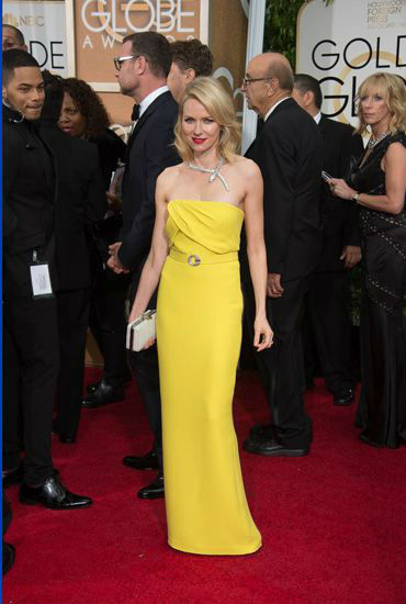 La actriz Naomi Watts se cuela otra vez entre las mejor vestidas con una pieza de escote palabra honor y color amarillo de Gucci. El mítico collar en forma de serpiente de Bvlgari y los labios en rouge terminaron de rematar uno de los looks más llamativos de la noche.