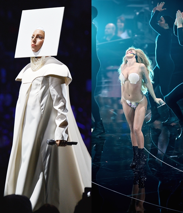 Lady Gaga estrenó en la gala su nueva canción “Applause” con un show espectacular. Empezó vestida de monja y finalizó con un biquini blanco. Para la gala dejo a un lado los vestidos de carne y nos sorprendió con un vestido negro largo de vinilo con escote en la espalda