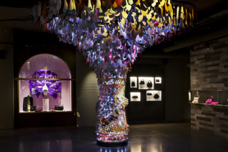 Un enorme árbol de piel interactivo invita a los visitantes a descubrir con sus propias manos las sugerentes propiedades del tacto de las numerosas pieles que Loewe ha perfeccionado, presentadas en multitud de colores y acabados. Este árbol, que brota del suelo para extenderse luego hacia arriba y por el techo, corrobora que el placer asociado al tacto de una buena piel es sin duda la prioridad de Loewe.
