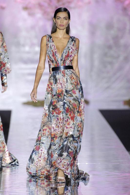 La idea del ornamento está presente en sutiles bordados que recrean los motivos del invernadero. Un jardín de cristal sobre vestidos de noche de tul y seda, en grises empolvados de rosa o en tonos lavanda y melocotón, diluidos suavemente en un print degradé.