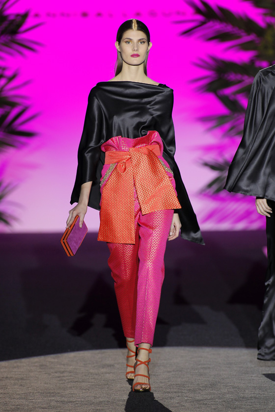Hannibal Laguna ha presentado sobre la pasarela española una colección con referencias explícitas e implícitas al exótico y fascinante Oriente; a sus aromas, sus colores y a la belleza floral de sus jardines ancestrales.