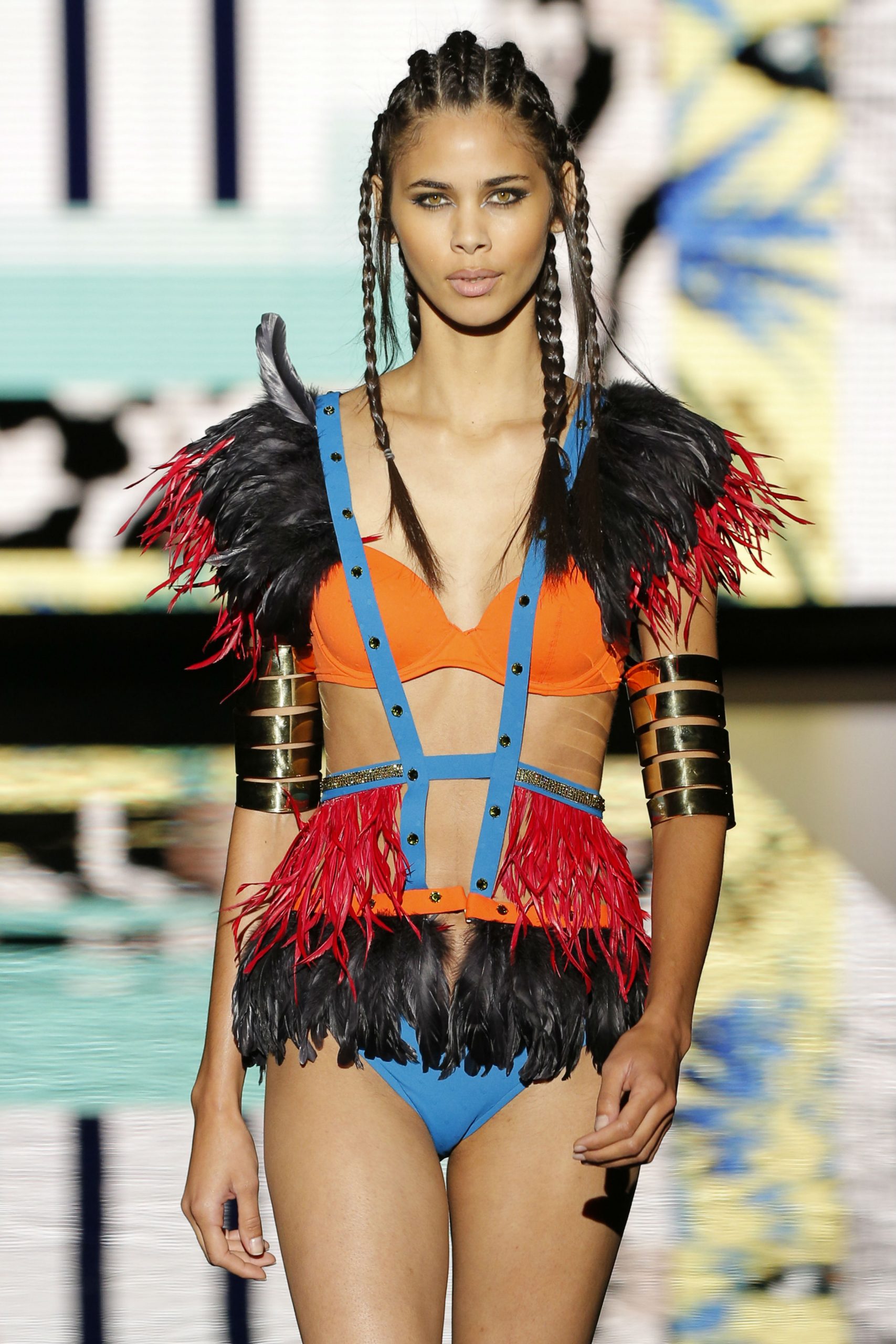 Siempre fiel al color negro, la casa española apuesta por un básico para completar sus looks. Ya sea en triquinis o vestidos confeccionados con plumas, el negro sigue siendo un indispensable para las propuestas de Andrés Sardá. Los accesorios son clave, elementos con forma de ojo y velos siguen la armonía de la tonalidad.