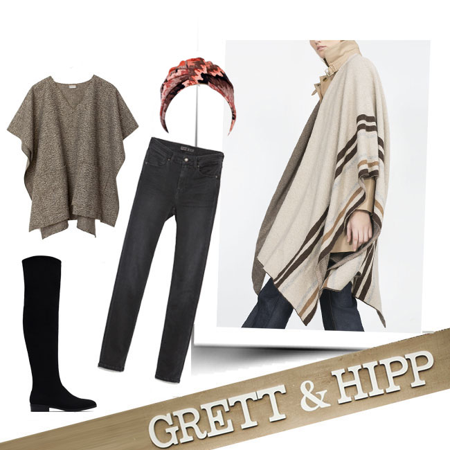 Ahora que las botas mosqueteras se han convertido en todo un must de este otoño invierno 2015/16, es el momento ideal para lucirlas en tus estilismos. Para evitar pliegues en el jean a la hora de emplear tus botas de caña alta, escoge un modelo skinny fit que se ajuste a tu figura como una segunda piel. Nuestra propuesta viene acompañada de un poncho, una opción perfecta para crear un juego divertido entre el pantalón denim ajustado y el poncho oversize. Por último, y no menos importante, un turbante de estampado retro que aporte vitalidad a un look neutro.