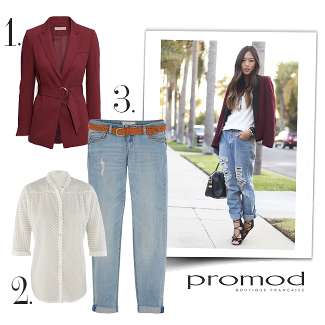 No tienes excusa, ya no es necesario que robes del armario de tu padre los deseados jeans boyfriend. Gracias a Promod puedes completar tu fondo de armario con unos pantalones súper cómodos e inspirados en el estilo boyish. Para dotar al look de un aire femenino, haz como la blogger Song of Style y apuesta por piezas que se enmarquen en tu cintura. Nuestra selección acompaña a los jeans con una blazer burgundy y una delicada camisa de cuello Mao.