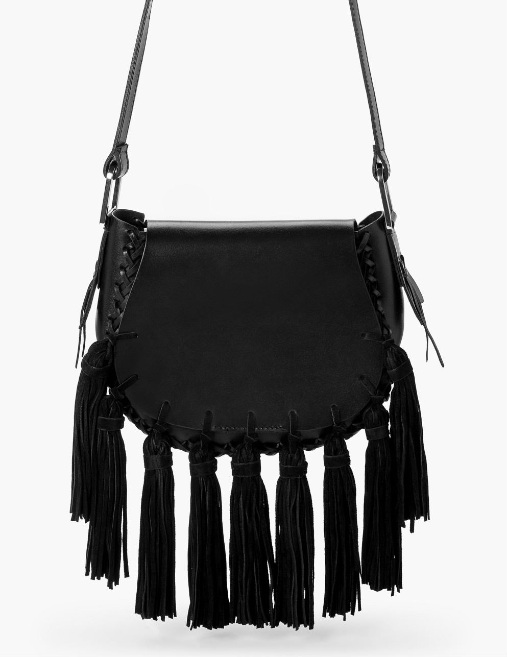 3. Flecos decorativos, solapa frontal, asa larga ajustable, cierre de botón a presión.
