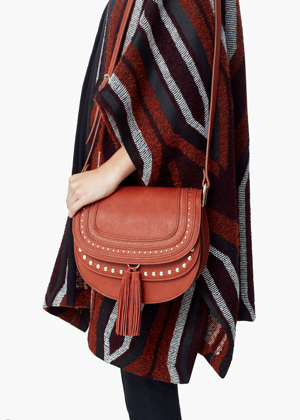7. Asa larga, efecto piel abatanada, doble compartimento, tachuelas decorativas, borlas decorativas, cierre de botón a presión.