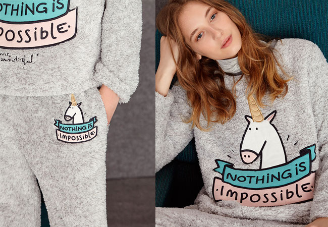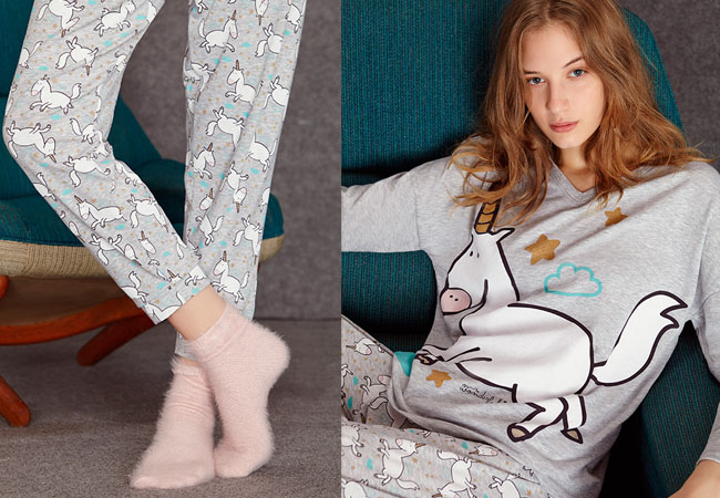 Para combatir el frío no hay nada mejor que un buen pijama de pelo. Su suavidad y la composición nos ayudan a sobrellevar las bajadas de las temperaturas con el mayor estilo. El print con unicornio aporta la nota de color a estas dos piezas que se tiñen de gris, una tonalidad versátil que nunca pasa de moda.