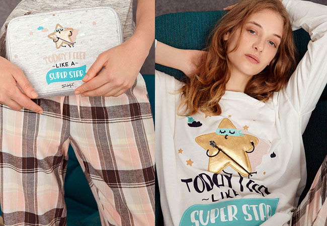 Si prefieres combinar diferentes motivos en tu look sleepwear esta será la opción perfecta. Los cuadros del pantalón se aderezan con estrellas doradas y detalles en turquesa. ¡Esta mezcla es un acierto seguro!