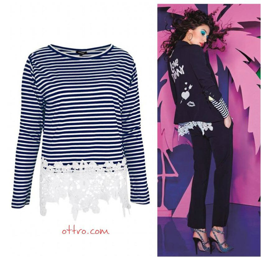 El estilo marinero se reinventa, una vez más, de cara a la primavera. Ottro.com dispone de esta favorecedora camiseta de manga larga con print marinero, en el que el bajo de crochet será el centro de todas las miradas. Nos encanta ver que la tendencia navy sigue siendo una de las tendencias que no desaparecen en el mundo de la moda.