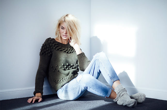 Los pompones adornan estratégicamente el suéter color caqui de punto. Nos encanta el toque desenfadado que aportan los jeans desgatados.