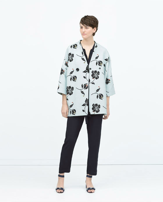 Si por algo se caracteriza la primavera es por las flores y la tienda de Inditex incluye este print hawaiano en uno de sus abrigos sobre un fondo azul celeste.