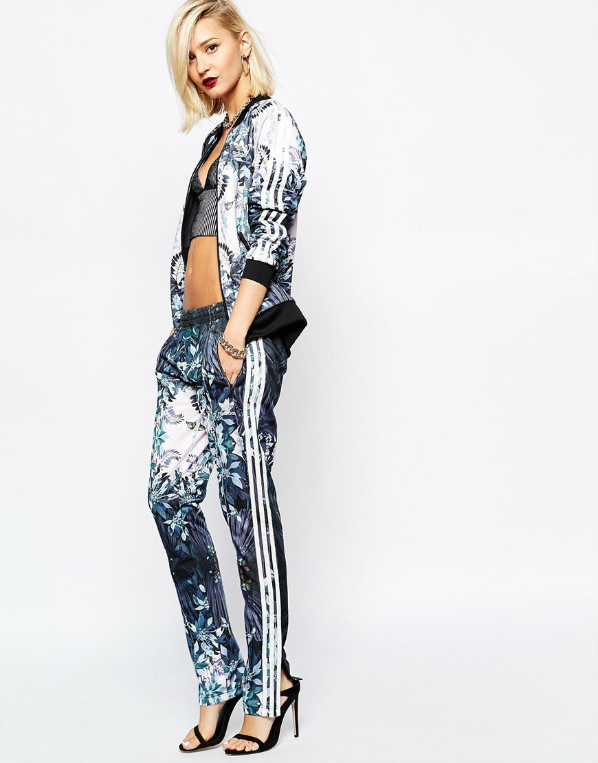 Es el momento de mostrarte la versión chic de esta moda “arreglada pero informal”. El print floral tiñe tanto la chaqueta como el pantalón de Adidas, que se combina con un cropped top de amplio escote y unas sandalias de tacón.