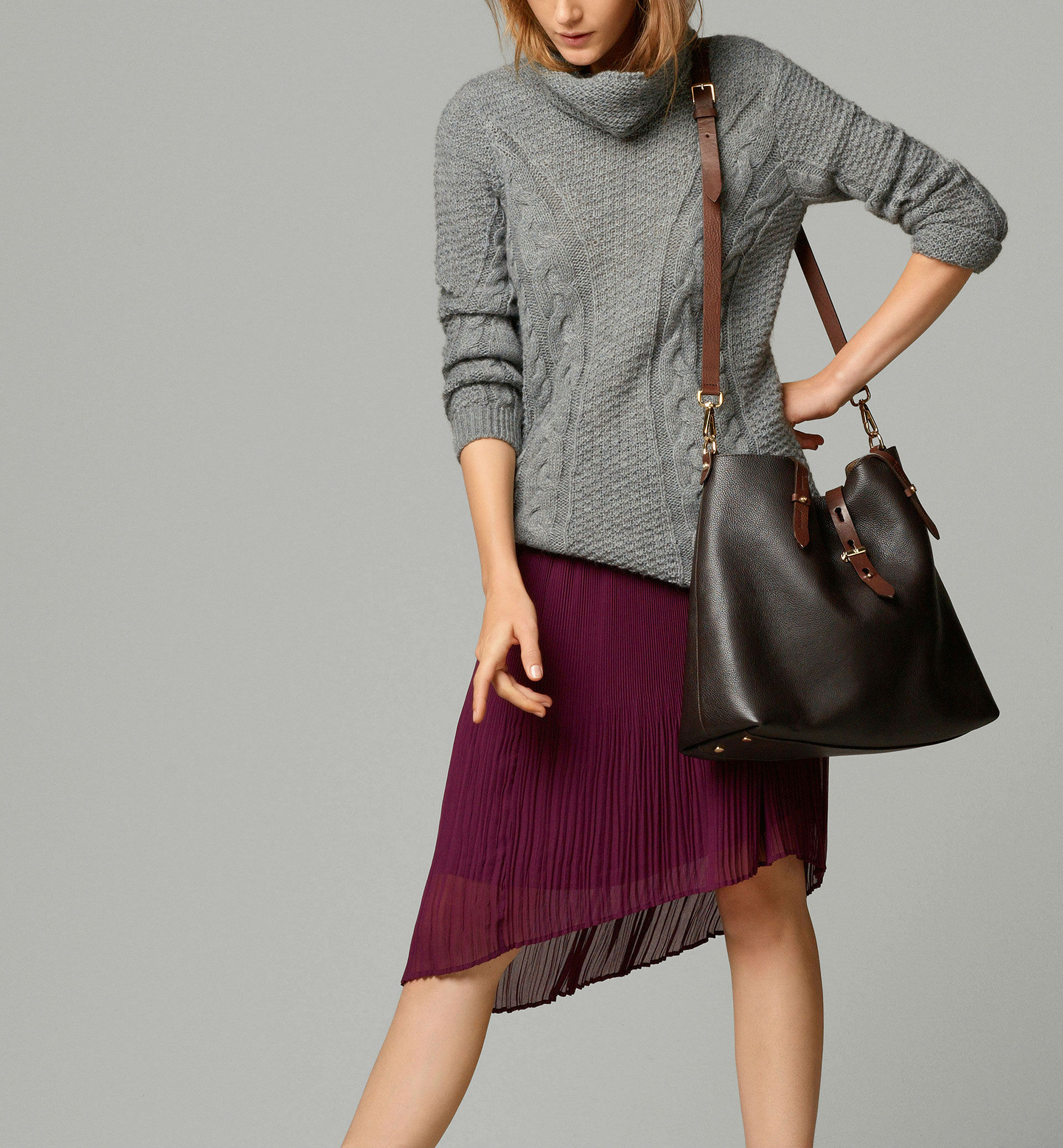 El color borgoña se cuela en nuestros estilismos aportando una nota de color muy otoñal. En faldas plisadas de bajo asimétrico dotan al look un toque muy sofisticado.