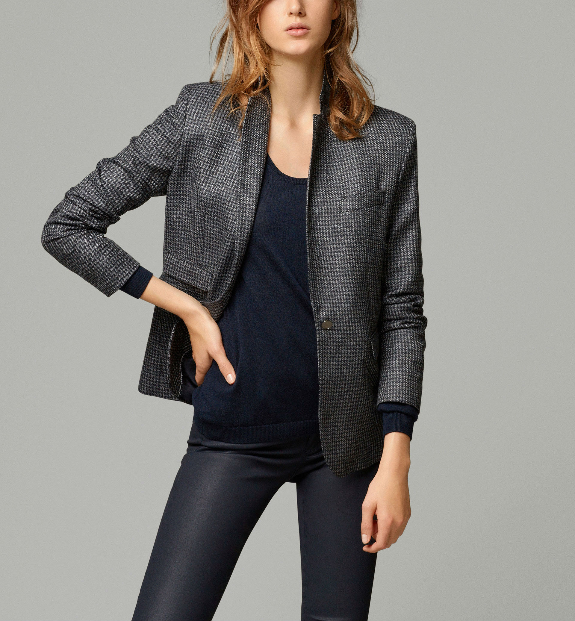 Una chaqueta blazer renovada hasta el extremo, así es esta prenda de Massimo Dutti con print de pata de gallo en versión XS.
