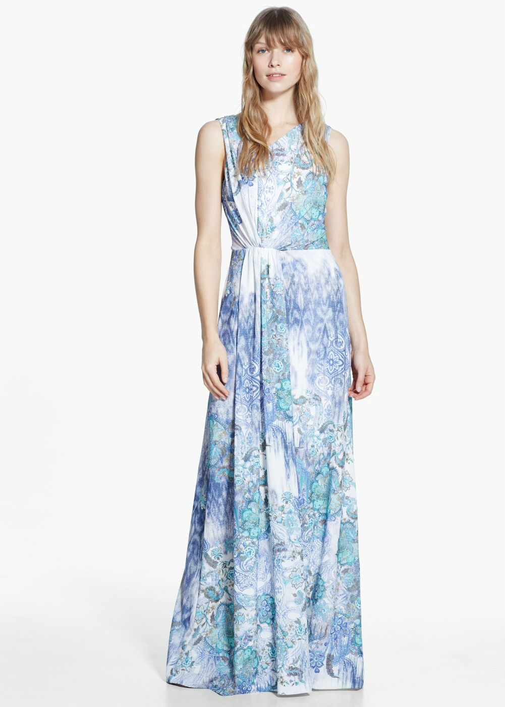 Vestido largo sin mangas estampado confeccionado en tejido fluido. Escote asimétrico, pliegues decorativos en la parte delantera, cierre de cremallera en la parte lateral y forro interior. (39,99€)