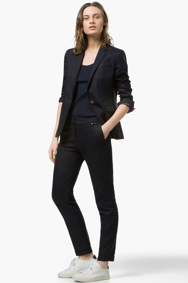 No todos los trajes son iguales. Massimo Dutti presenta su colección más elegante y sofisticada para esta primavera. Entre los diferentes diseños de la colección puedes encontrar pantalones anchos con acabado efecto denim confeccionado con tejido italiano y algodón. Es un estilo más informal a la vez que mantiene la elegancia de la firma. Decídete también por unos mocasines en tono marrón y un pañuelo con estampados en marino para ser un conjunto «working girl» perfecto.