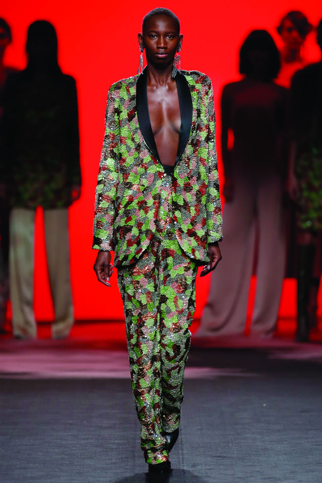 Un año más la pasarela se llena de sensualidad, libertad y seducción de la mano del diseñador Juan Duyos quien abre la segunda jornada de desfiles en Mercedes Benz Fashion Week Madrid 2015. Bajo el brillo y ambiente de la música disco, con bola incluida, al más puro años 70, la modelo Awa Lo fue la encargada de encabezar el desfile con un traje de dos piezas de lentejuelas con chaqueta XL.