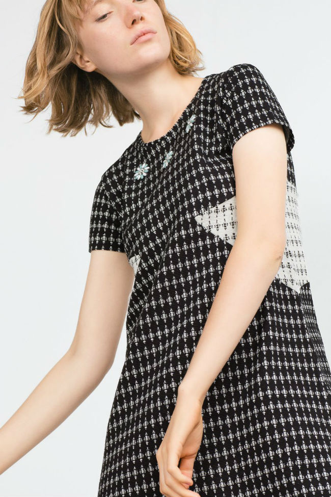 El verano es una época calurosa donde las faldas y los vestidos son las prendas estrellas. Pero… ¿qué pasa con el otoño y el invierno? ¡Pues también! No podemos remediarlo, y es que los vestidos son una prenda que nos favorece a todas, y Zara lo sabe. Es por eso que hoy os seleccionamos el top ten de vestidos imprescindibles para la próxima temporada. El primer diseño que os mostramos pronto será un imprescindible en tu armario, y es que este vestido Jacquard con joyas y de cuello redondo es ideal tanto para una reunión de trabajo como para un paseo romántico.