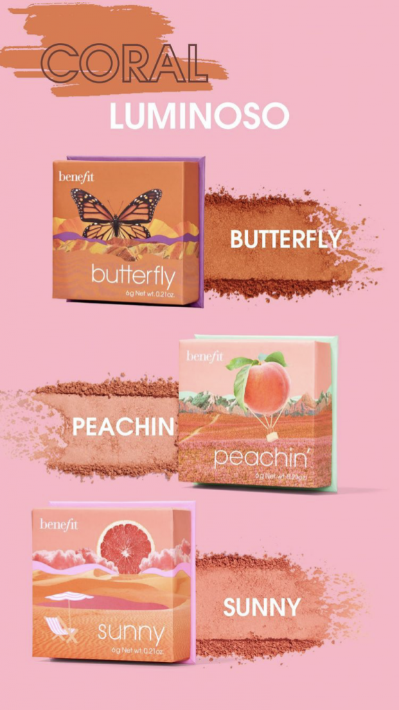 La gama de corales es ideal para potenciar e iluminar nuestro bronceado. Butterfly, Peachin y Sunny son los coloretes con subtono naranja que forman parte de esta categoría.