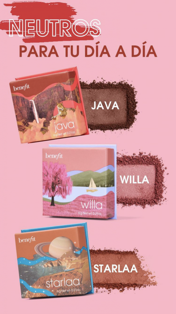 Java es un moca rosado con efecto satinado. Willa es un colorete rosado con acabado satinado al igual que Java, y Starlaa es un dos en uno, un bronceador y colorete rosa con un acabado de brillo sutil.