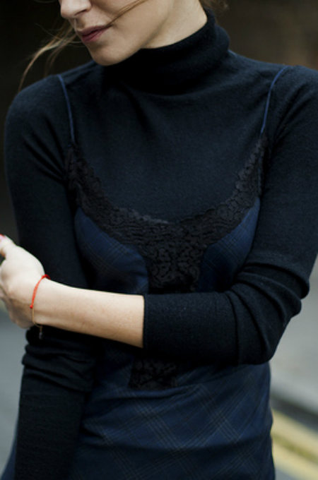 Para ello, en esta ocasión elige un vestido lencero de Zara que lo combina con un jersey de Topshop. Utiliza como calzado unos botines negros con hebilla grande, las botas moteras vuelven a ser un must have para este otoño invierno.