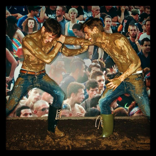 No obstante, las grabaciones eran de conciertos en directo, consiguiendo así un toque más real y divertido. Además, a mitad del desfile, la pared principal del escenario se giró para convertirse en un falso fondo de festival de música, mientras los modelos bailaban y jugaban con el barro. Y a todo esto, las botellas de Heineken, acompañaban el evento, quitando importancia a la ropa en sí y proporcionando un mayor espíritu e ideología de marca. Vive tu juventud y disfruta de la vida.