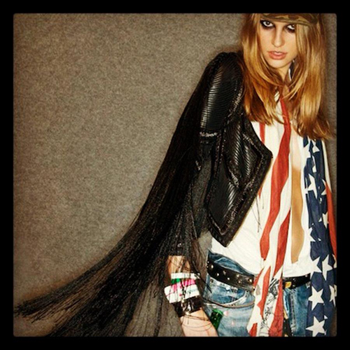 La marca italiana ha hecho un mix and match de inspiraciones varias como el Festival Glastonbury de Reino Unido y los conciertos hippy de rock de los 60s y 70s usando la bandera americana como tema estrella y otros detalles rockeros de la época como los flecos, el cuero, el tejano y las tachuelas. Pero no se habla sólo de rock de los setenta, también hacen referencia al skate, como vemos en las fotos de la capñana y en los estilismos del desfile, incorporando los típicos calcetines blancos con las dos líneas de colores que se utilizaban en los primeros años del skate. También hacen un guiño al grunge de los noventa, con las camisas de cuadros masculinas anudadas a la cintura, y por supuesto, un dato clave que nos recuerda en que temporada estamos: los neones. Sí señor, han combinado todos estos rasgos con toques de neón en las gafas, relojes y otros accesorios.
