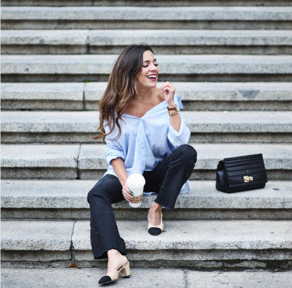 Ambas lucen una camisa over size, en color azul claro, jean oscuro con los bajos rasgados que dan un toque informal, unos zapatos de charol bicolor con tacón de Chanel y una cartera negra con cierre dorado que le da elegancia al outfit.