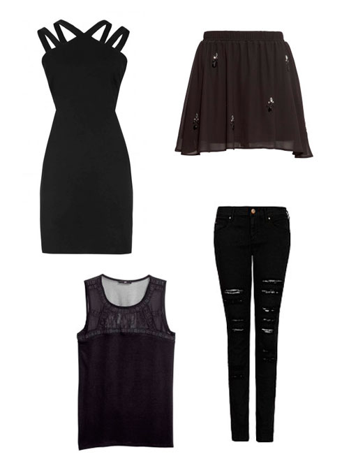 Un vestido ajustado (Primark), una falda (H&M), unos jeans (Mango) y una camiseta de encaje (H&M) para que los combines con los colores y accesorios que tu prefieras. Estarás ideal para cualquier fiesta!