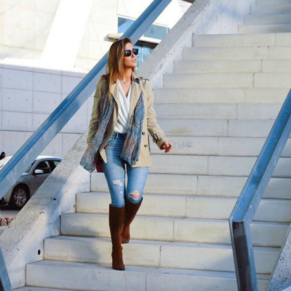Su segunda propuesta se basa en las tonalidades tierra, un combo en el que los jeans con aberturas son imprescindibles. Combina una gabardona con este must have y crearás un estilismo chic con básicos de cualquier armario.
