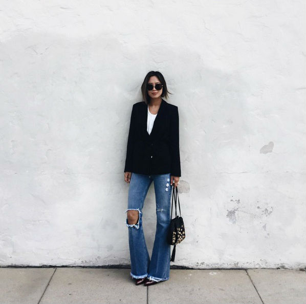 Song of Style se decanta por un estilo más elegante y afrancesado, en el que los jeans rotos se unen con prendas sofisticadas. La primera propuesta que te mostramos de esta blogger internacional nos enseña que unos pantalones de aires seventies pueden casar ala perfección con una blazer y una camiseta blanca. Sencilla y perfecta.
