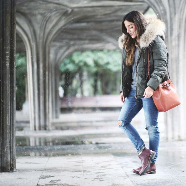 Paula Ordovás, más conocida como My Peep Toes, desprende toques casual y desenfadados en estos dos looks. El primero está compuesto por una parka caqui, un bolso bombonera y botines, un conjunto de prendas y accesorios que muestran su cara más cool gracias a los jeans con aberturas en las rodillas.