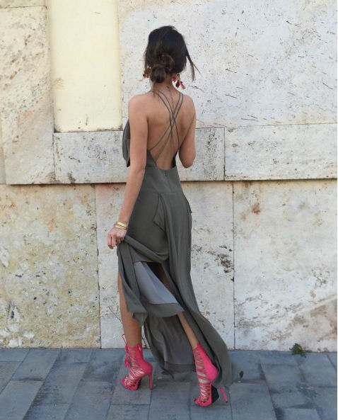 En su fondo de armario tampoco faltan los vestidos largos, ideales para citas de tarde-noche. Ahora que el calor empieza a apretar, opta por un modelo como el que luce la instagramer de tejido vaporoso, así te sentirás segura y cómoda. Nos encanta la combinación del caqui con el coral de las sandalias de tacón, una fusión de colores perfecta para esta primavera verano 2016.