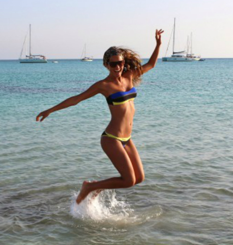 Malena Costa ha estado de vacaciones en Mallorca luciendo su cuerpo de escándalo con un biquini de Calzedonia. Las rayas en azul Klein, negro y  amarillo resaltan el moreno y favorecen mucho.