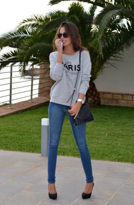 Silvia Navarro del blog 1sillaparamibolso combina la famosa sudadera gris de Mango con unos jeans pitillo y tacones. Un look “arreglado pero infomal” para el día a día.