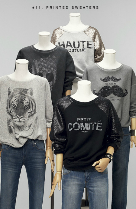 Si te gusta esta tendencia, estás de suerte. Mango apuesta por las sudaderas en su nueva colección para otoño invierno 2013/14 en multitud de diseños. Con lentejuelas, gráficos y mensajes y en colores clásicos como el gris y el negro para que la combines con todo tipo de prendas.