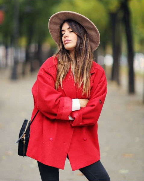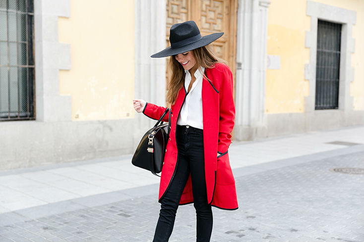 Tampoco My Peep Toes ha podido resistirse a sus encantos y aquí lo luce con varias tendencias. Ella escoge un modelo de ala muy ancha en color negro y un abrigo de corte militar en rojo como sus dos must have. Un look básico pero que destaca por la sencillez de las tonalidades y el estilo que desprende todo el combo.