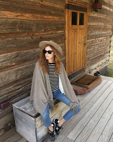 Chiara Ferragni apuesta por un look entre lo rústico y Sporty Chic, la It Girl sabe muy bien cómo unir prendas inspiradas en estilos totalmente opuestos. Un maxi poncho con flecos en el bajo dota al outfit de toque folk, la camiseta de rayas Bretón destila allure francés y las deportivas de New Balance aportan ese glamour deportivo que tanto nos gusta. El sombrero termina de rematar un look comfy y de lo más casual.