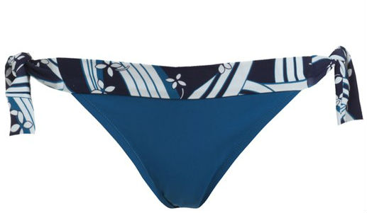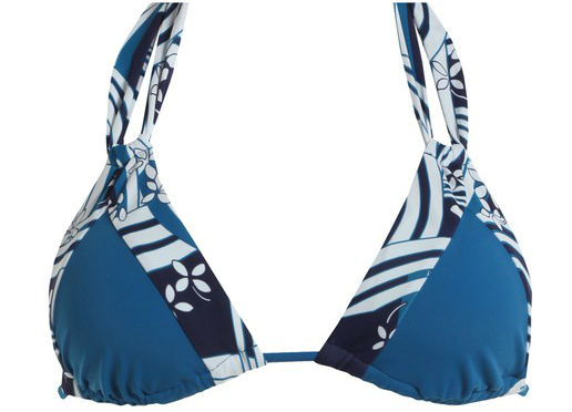 La parte superior cuenta con copas extraíbles, pudiendo elegir el tamaño de tu pecho, y su color azul decorado con líneas y flores resaltará tu bronceado. Precio: 12’97€