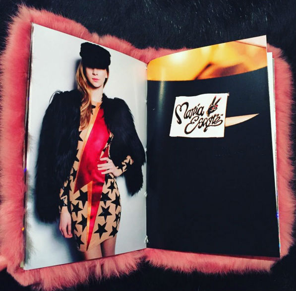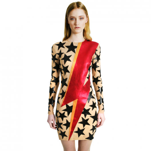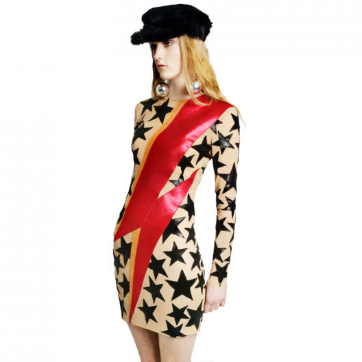 Se trata de un vestido de la diseñadora española María Escoté, concretamente el modelo Bowie. Un diseño hecho a mano con fondo beige y cuajado de estrellas en color negro. El rayo rojo, característico del cantante que da nombre al vestido, atraviesa todo el vestido dotando a la prenda de un toque original y llamativo. ¿Su precio? 690€.