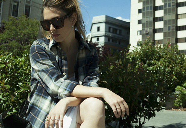 La actriz combina una camisa con print de tartán que consiguió en la sección masculina de la famosa tienda Abercrombie&Fitch. Para rematar el look, optó por un vestido blanco estilo ‘lady’ que rompe con todo el estilismo.