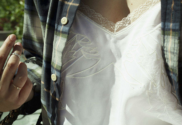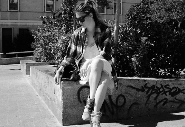 Vestido blanco lencero de Zadig&Voltaire y camisa “boyfriend” de cuadros de Abercrombie&Fitch
