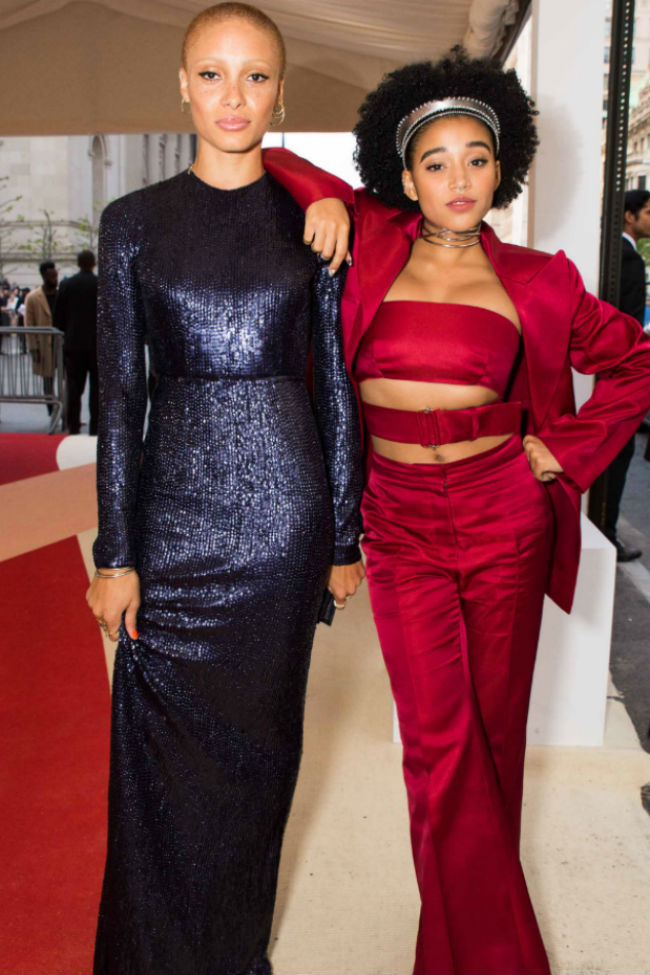 Amandla Stenberg (actriz) y Adwoa Aboah (modelo) posaron juntas con dos estilismos muy diferentes. Mientras la primera se decantaba por un traje customizado en color merlot de raso, la top vistió un vestido de lentejuelas azul marino de manga larga.