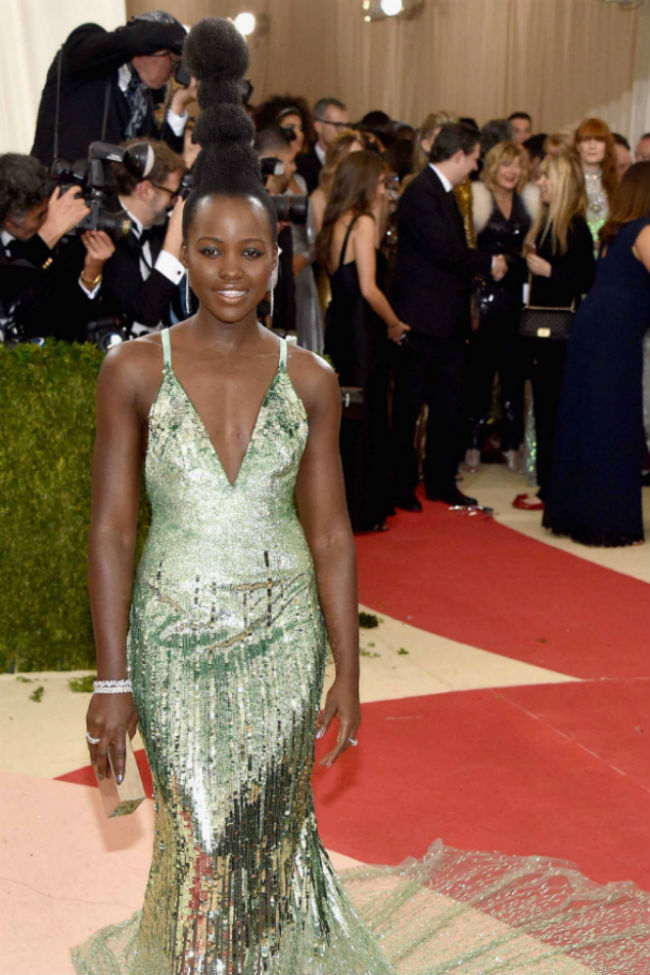 Lupita Nyong’o, una de las estrellas que más focos acapara en sus apariciones públicas, vistió un vestido customizado de la firma elaborado en lentejuelas en color jade y tirantes de terciopelo. Aunque el peinado iba acorde con la temática de esta edición, otro look beauty hubiera sido más acertado.